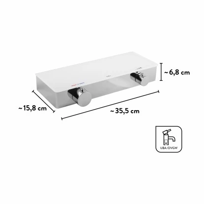 Die schicke baliv Thermostat-Duscharmatur DU-2070 weiß deine Dusche gekonnt in Szene zu setzen. Sie begeistert mit einem edlen Look in Weiß und Chromoptik. Aussehen ist aber nicht alles: Dank nützlicher Extras ermöglicht die Armatur dir ein tolles Duschvergnügen. Um dir ein angenehmes Duschen zu bieten, ist die Armatur mit einem Thermostat ausgestattet. Dieses hält die Wassertemperatur konstant und sorgt dafür, dass du dich nicht verbrennst und keinen Kälteschock unter Wasser bekommst. Möchtest du die Temperatur höher als 38 °C einstellen, dient der Verbrühschutz als Sicherheit. Bevor du weiter drehen kannst, musst du vorher einen Knopf drücken.