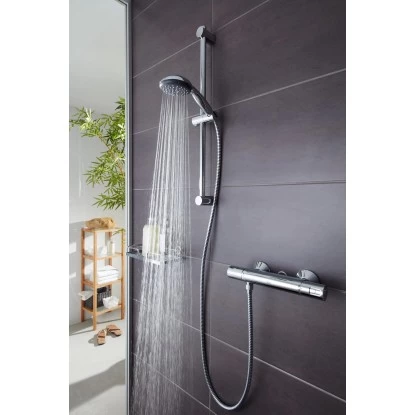 Die Grohe QuickFix Precision Start Thermostat-Brausebatterie mit Brausegarnitur sorgt für ein großartiges Duscherlebnis. Das 4-teilige Set besteht aus einer Handbrause, einem Brauseschlauch, einer Duschstange und einem Thermostat.
