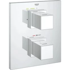 Geben Sie Ihrem Bad, mit der stylischen Grohe Thermostat-Brausearmatur Grohtherm Cube, im eckigen Design, eine moderne Optik. Das spiegelnd schöne Bedienelement für Brausen, macht eine glänzend schöne Figur und steuert das Thermostat in der Wand. Mit den würfelförmigen Griffen, die gut in der Hand liegen, regeln Sie bequem die Wassermenge und -temperatur.