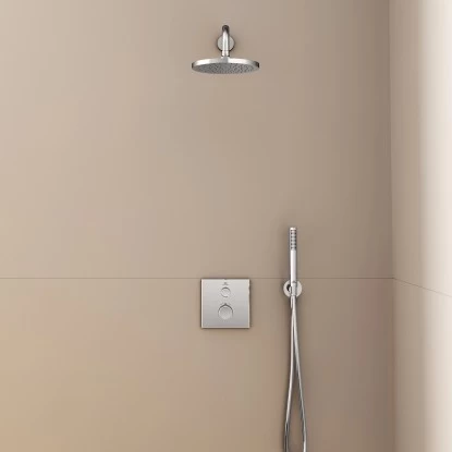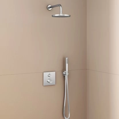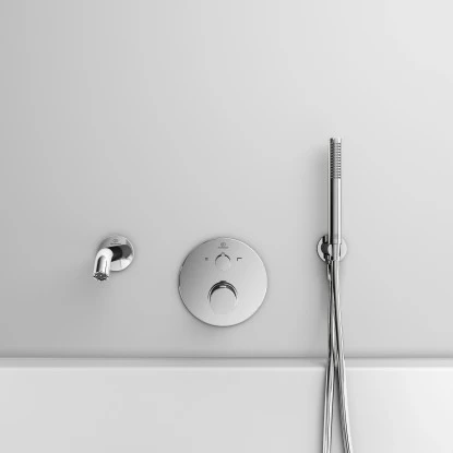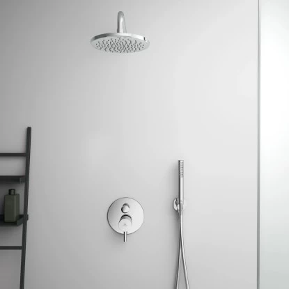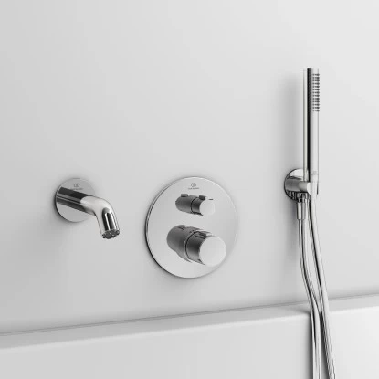 Idealrain ist ein vollständiges Brauseprogramm mit allen Komponenten zur Ausstattung eines schönen und komfortablen Duschbereichs. Dazu zählen zum Beispiel Handbrausen mit Navigo-Umschaltung und formschöne Kopfbrausen.