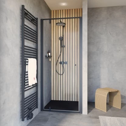 Eine praktische Besonderheit der Trend 2.0 Duschabtrennung ist das Drehlager der Tür, das ein weites Öffnen der Tür nach außen ermöglicht, ohne dass sie an die angrenzende Wand schlägt. Dank des Drehlagers können Heizkörper oder Handtuchhalter direkt neben dem Duschbereich platziert werden, was die Nutzung des Badezimmers optimiert.