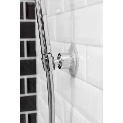Eine praktische Möglichkeit zum Einhängen der Handbrause bietet der Duschkopfhalter 360° von WENKO in Chrom. Dabei wird der hochwertige Halter selbst ganz einfach ohne Bohren an der Wand befestigt.