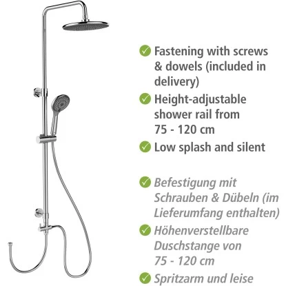 Das Duschsystem Watersaving von Wenko in Chrom wird an zwei Wandhaltern aus Metall mit Schrauben und Dübeln, die im Lieferumfang enthalten sind, an der Wand befestigt. Ganz einfach kann das System an eine bestehende Armatur oder einen Wandanschlussbogen angeschlossen werden. Zudem ist die Duschstange höhenverstellbar von 75 bis 120 cm, sodass die Regendusche individuell passend platziert werden kann. Das System ist für Duschen mit Durchlauferhitzer geeignet.