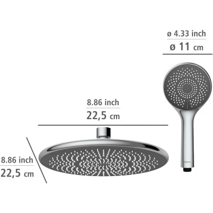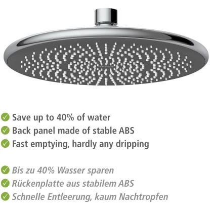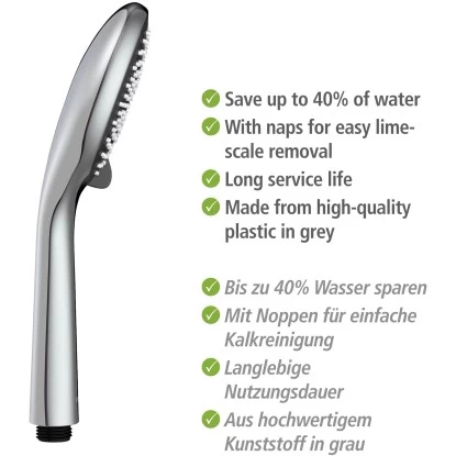 Verwandeln Sie die Duschkabine in ein entspannendes und ressourcenschonendes Wellness-Paradies mit dem Wenko Duschsystem Watersaving Chrom. Das System bringt alle Elemente mit, die aus der Dusche eine kleine Oase im heimischen Badezimmer machen. Das Duschsystem besteht aus einer hochwertigen Duschstange aus rostfreiem Edelstahl, einem Regenduschkopf (Ø 22,5), einer Handbrause (Ø 11), einem Duschschlauch und einem Brausegleiter. Mit Duschköpfen mit Watersaving-System sparen Sie bis zu 40 % Prozent Wasser. Dafür sorgt ein Einsatz, der den Wasserdurchfluss konstant hält, gleichzeitig aber weniger als 8 Liter Wasser pro Minute verbraucht (bei 3 Bar Wasserdruck).